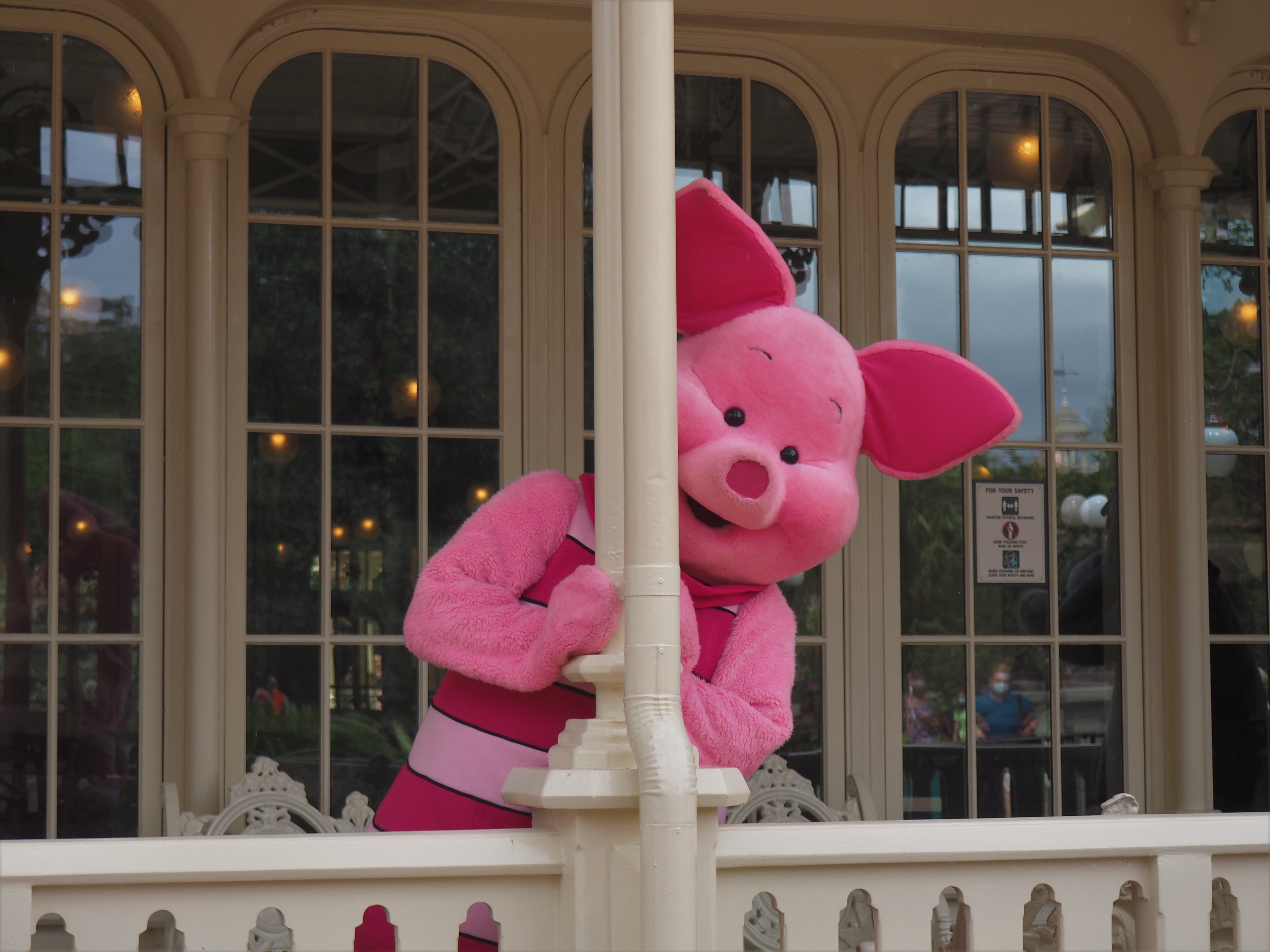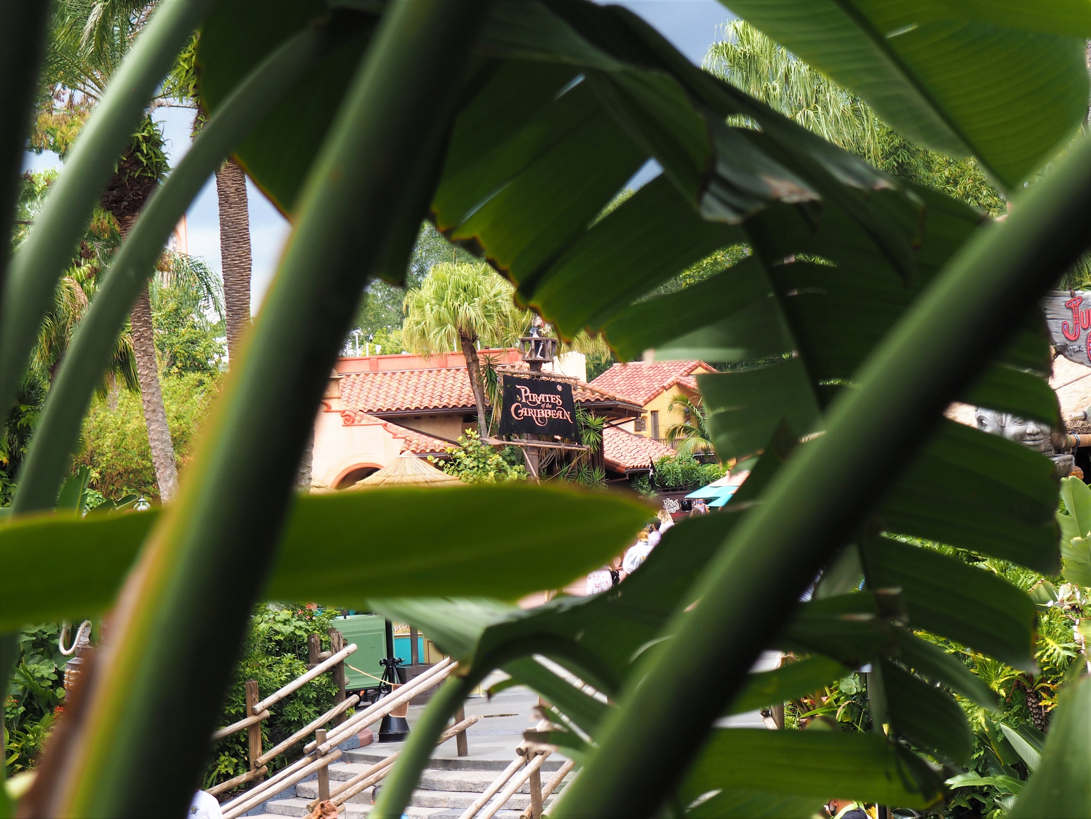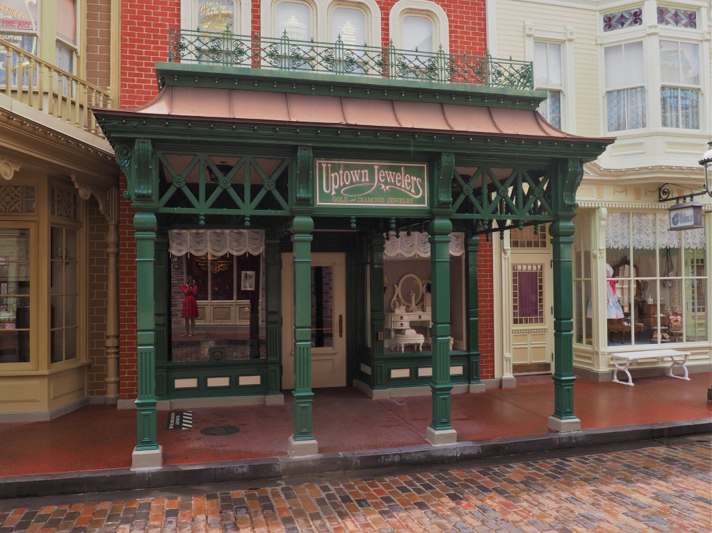 We took our time walking in a clockwise path around the park. I stopped multiple times to take photos of things that guests normally walk past or never notice. While climbing around the Swiss Family Treehouse I spotted the Pirates of the Caribbean flag through some palm fronds! I thought it was so cool that from different vantage points around the park you can see so much! Everyone rushes to get so much done that they forget to look around and take in all that the park offers. Sometimes, the coolest parts are more hidden and take a good eye to spot, like the featured photo on the post. I never noticed the small statues around the castle and the corresponding statues. Chip and Dale look like they are dancing! Or like the photo I took on Main Street. If you ever have the time stop and look in all the perfectly decorated shop windows.